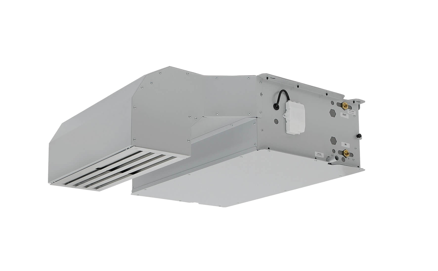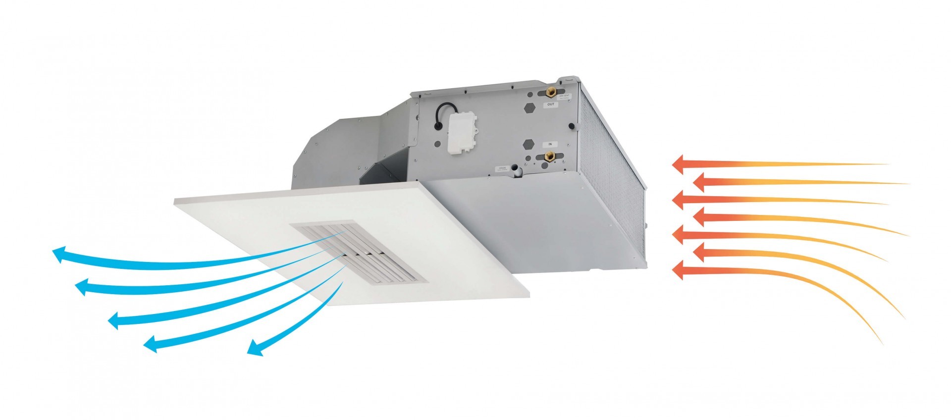 Il flusso orizzontale aderente al soffitto assicura distribuzione uniforme dell’aria senza correnti dirette. La griglia integrata è progettata per massimizzare la gittata del flusso.